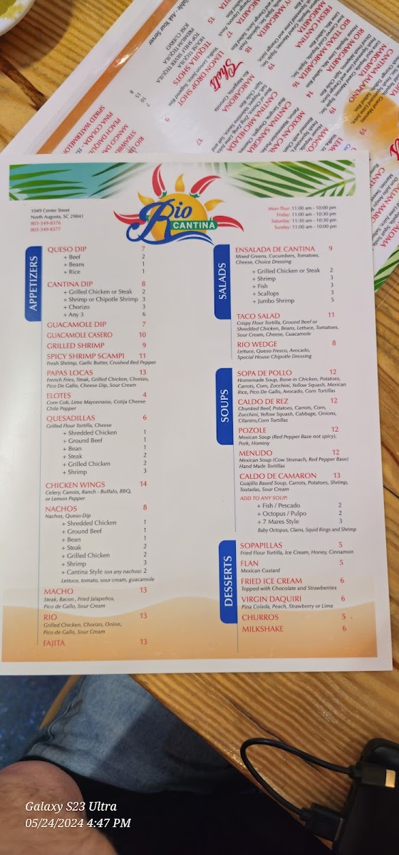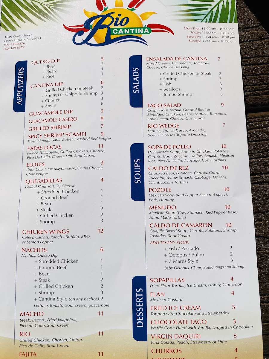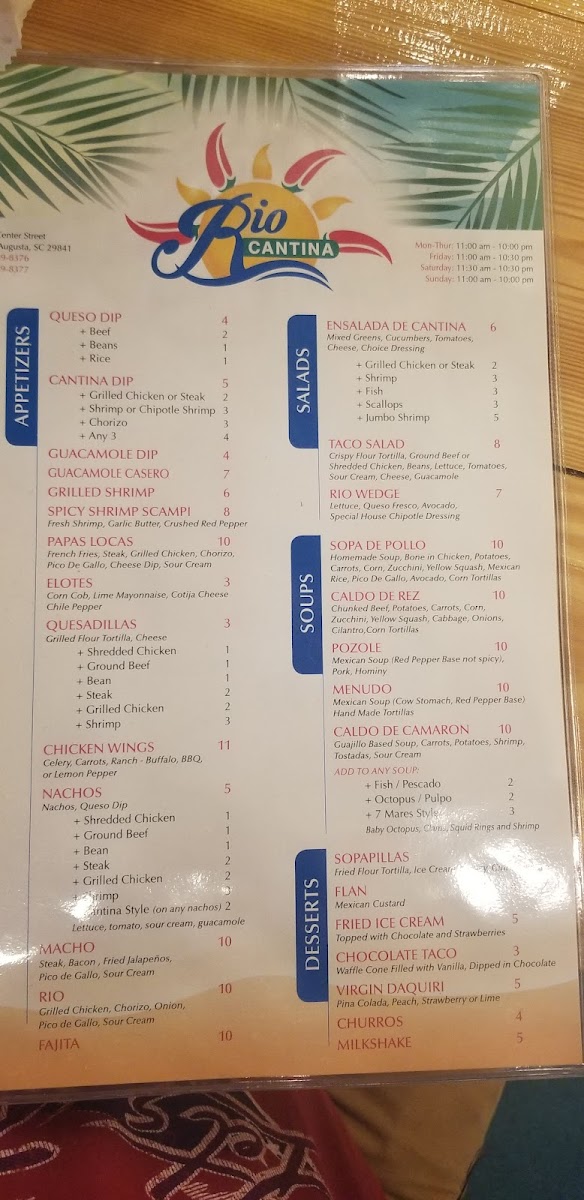 + Chicken $14, + Steak $14, + Mixed $15, + Shrimp $16, + Veggie $13, + Rio Style $17 (Chicken, Steak, Shrimp), + Cantina $19 (Chicken, Steak, Shrimp, Carnitas, Chorizo), + Fajita for 2add $4, + Fajita Quesadilla $14 (Two Flat Grilled Tortillas, Cheese, Chicken, or Beef Fajitas, Salad Plate. + Shrimp $3)